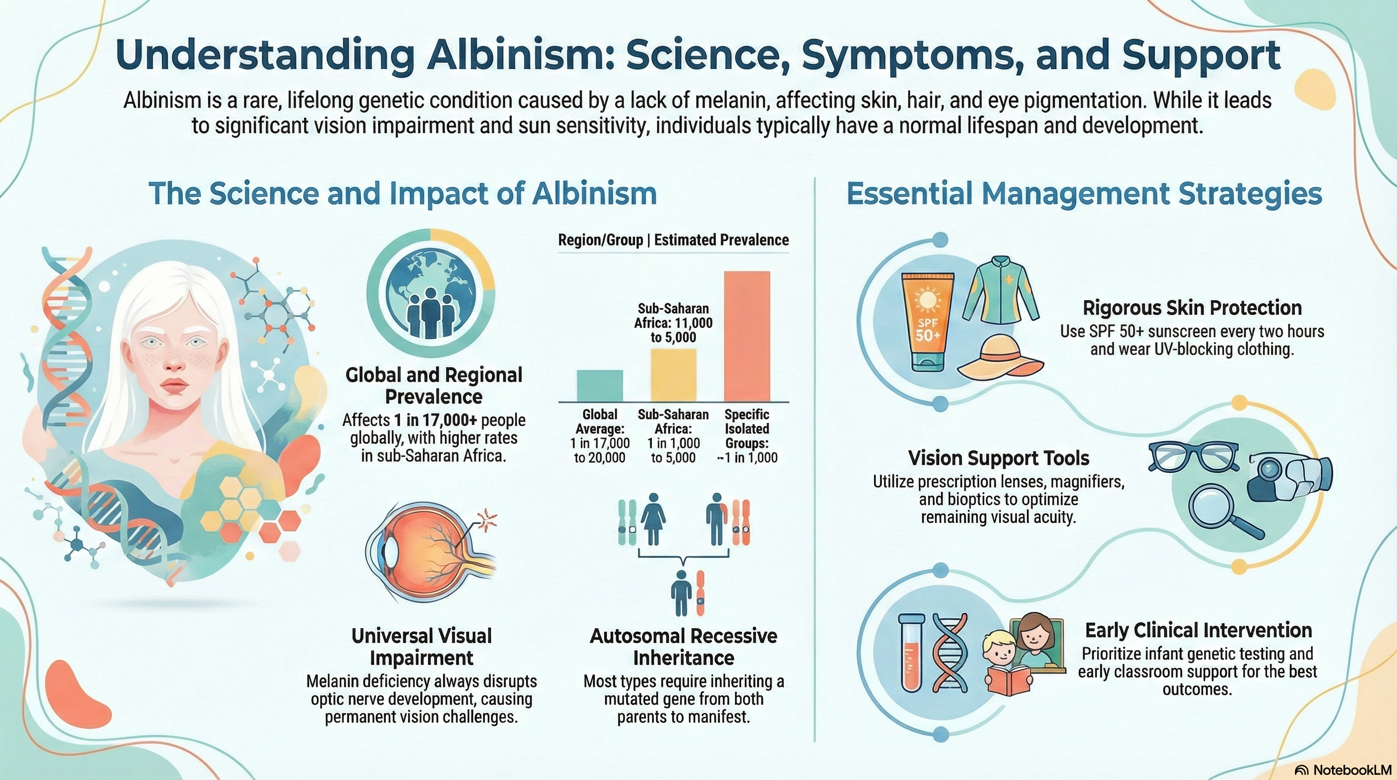 On average, albinism affects approximately 1 in 17,000 to 20,000 people globally. However, prevalence varies significantly by region and group. In sub-Saharan Africa, rates are higher, reaching 1 in 1,000 to 5,000 in parts of Tanzania and Zimbabwe. Certain isolated groups, such as specific Native American tribes and Pacific Islanders, also show a higher prevalence of about 1 in 1,000. It is important to note that albinism is a lifelong condition, not a disease, and individuals with albinism typically have a normal lifespan, intelligence, and development.