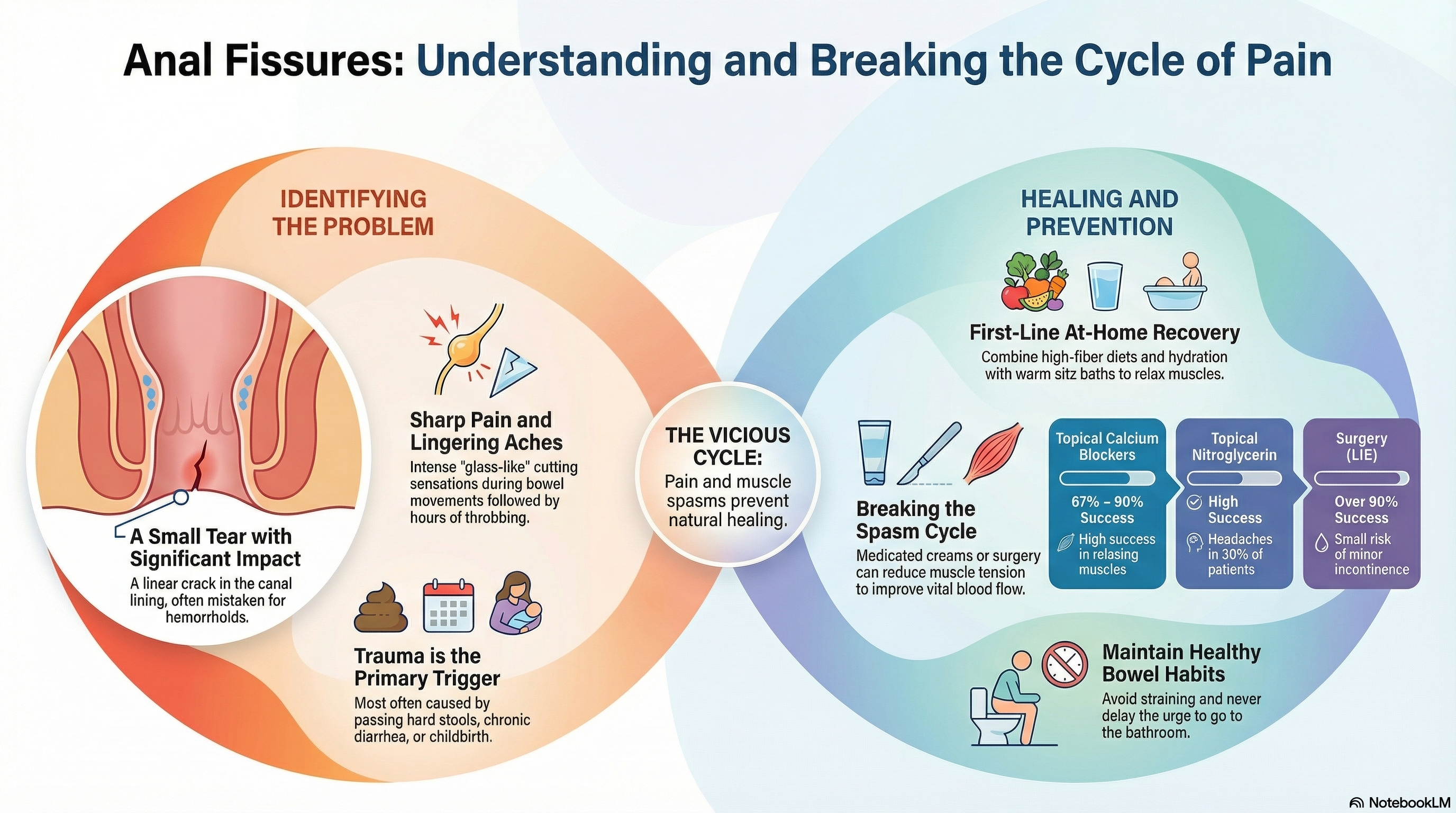 The goal of treatment is to break the "vicious cycle" of pain, muscle spasm, and reduced blood flow. By relaxing the muscle and softening the stool, the tissue can finally heal.