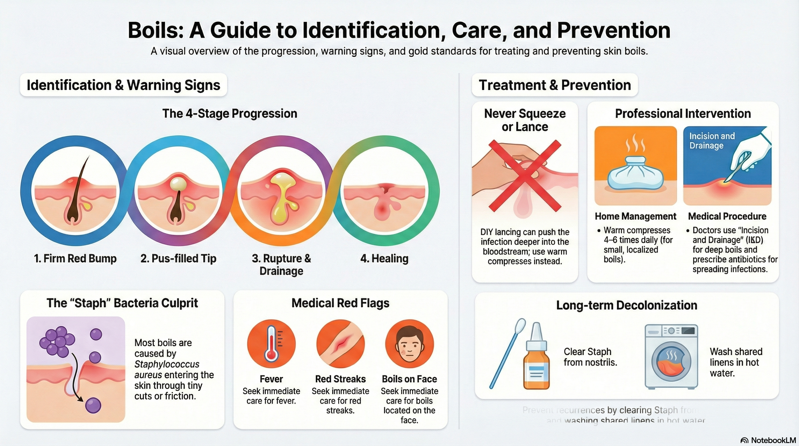 Treatment depends on the size and location of the infection. Never attempt to squeeze or lance a boil yourself, as this can push the infection deeper into the bloodstream.