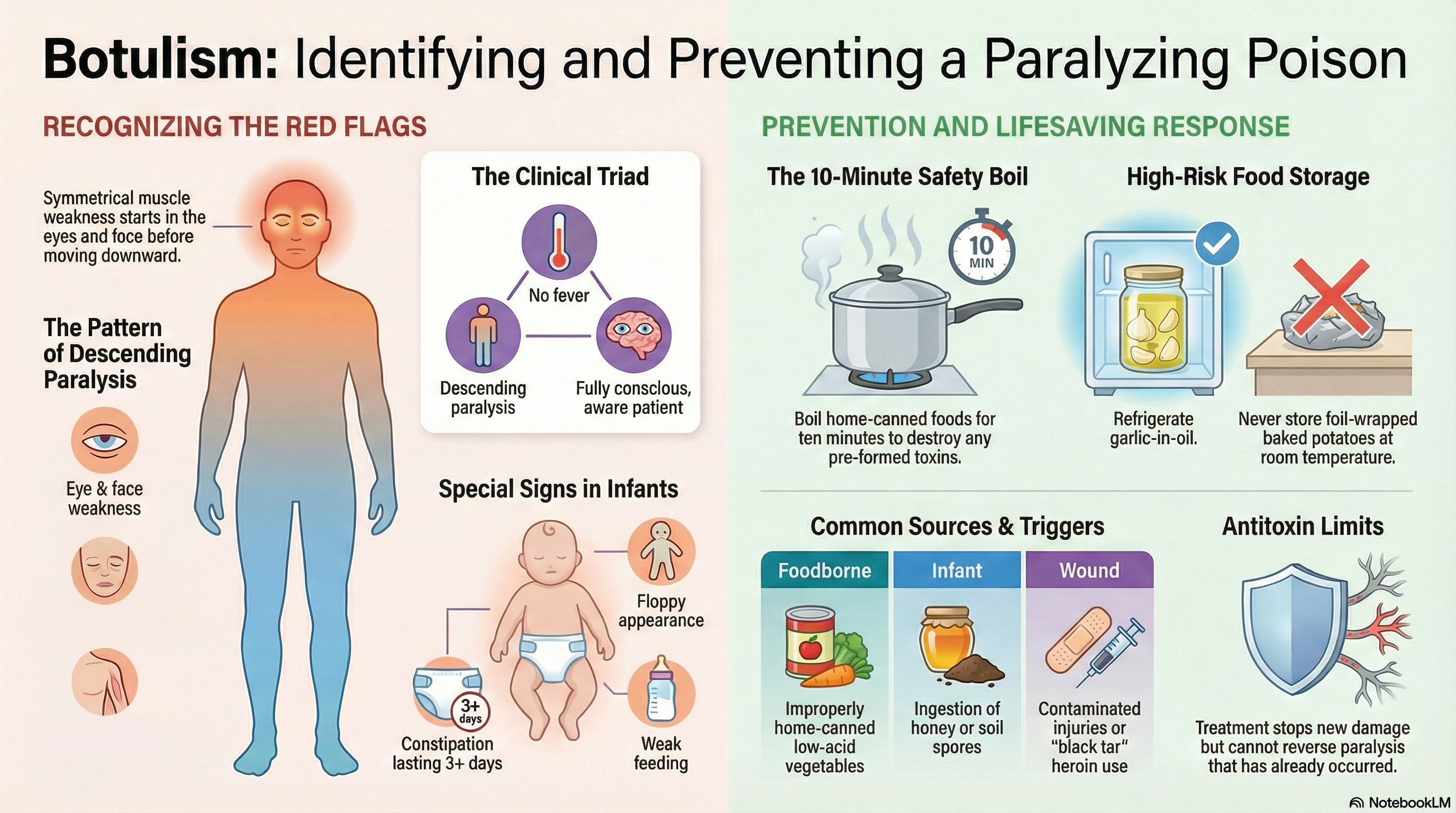 Botulism is a neuroparalytic disease, meaning the toxin attacks the body's nerves and causes muscle paralysis. The hallmark of the condition is "descending paralysis"—weakness that starts in the head and face and moves down to the neck, chest, arms, and legs.