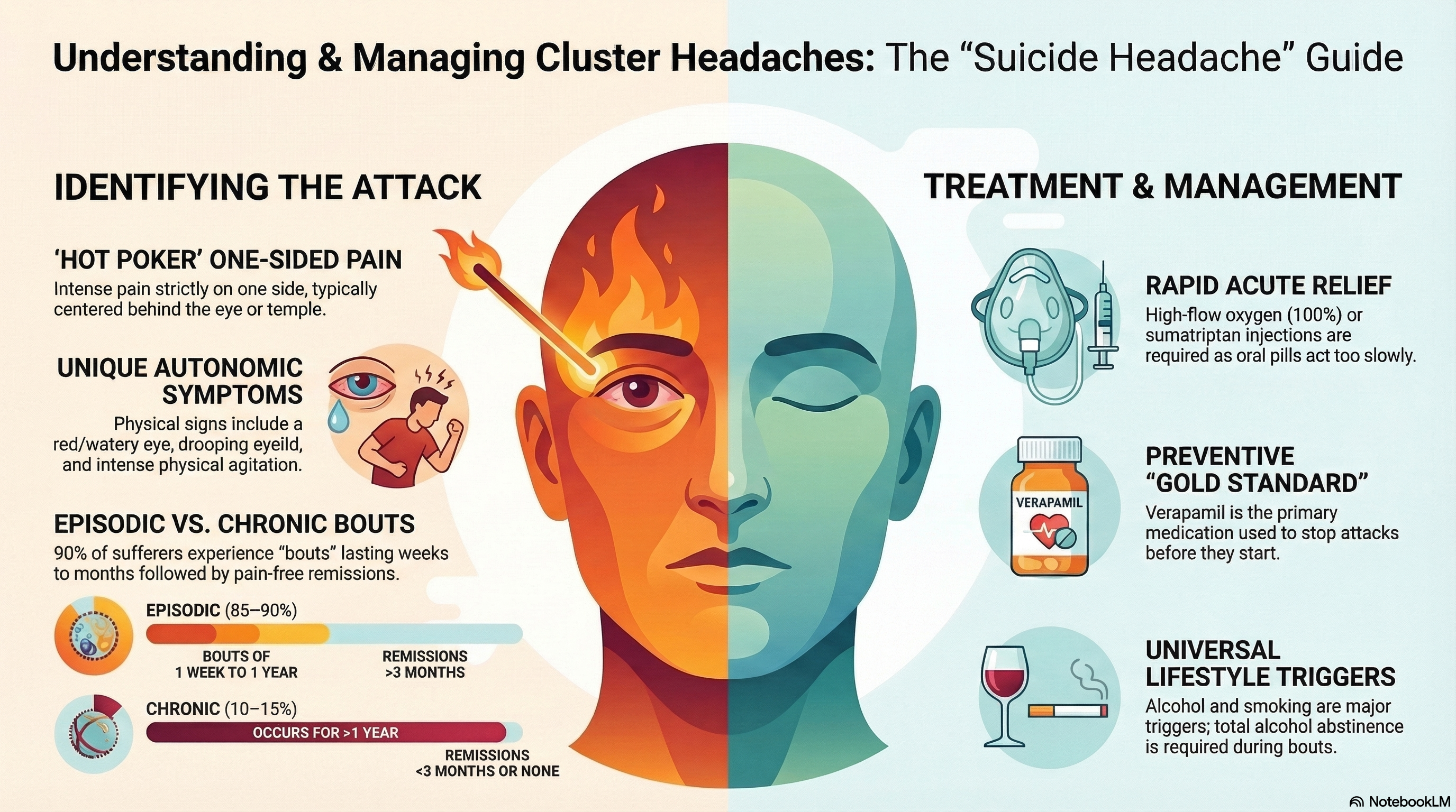 Reliable Triggers: During a cluster period, alcohol is a near-universal trigger. Other triggers include strong smells (petrol, paint, or perfume), heat, and napping during the day.