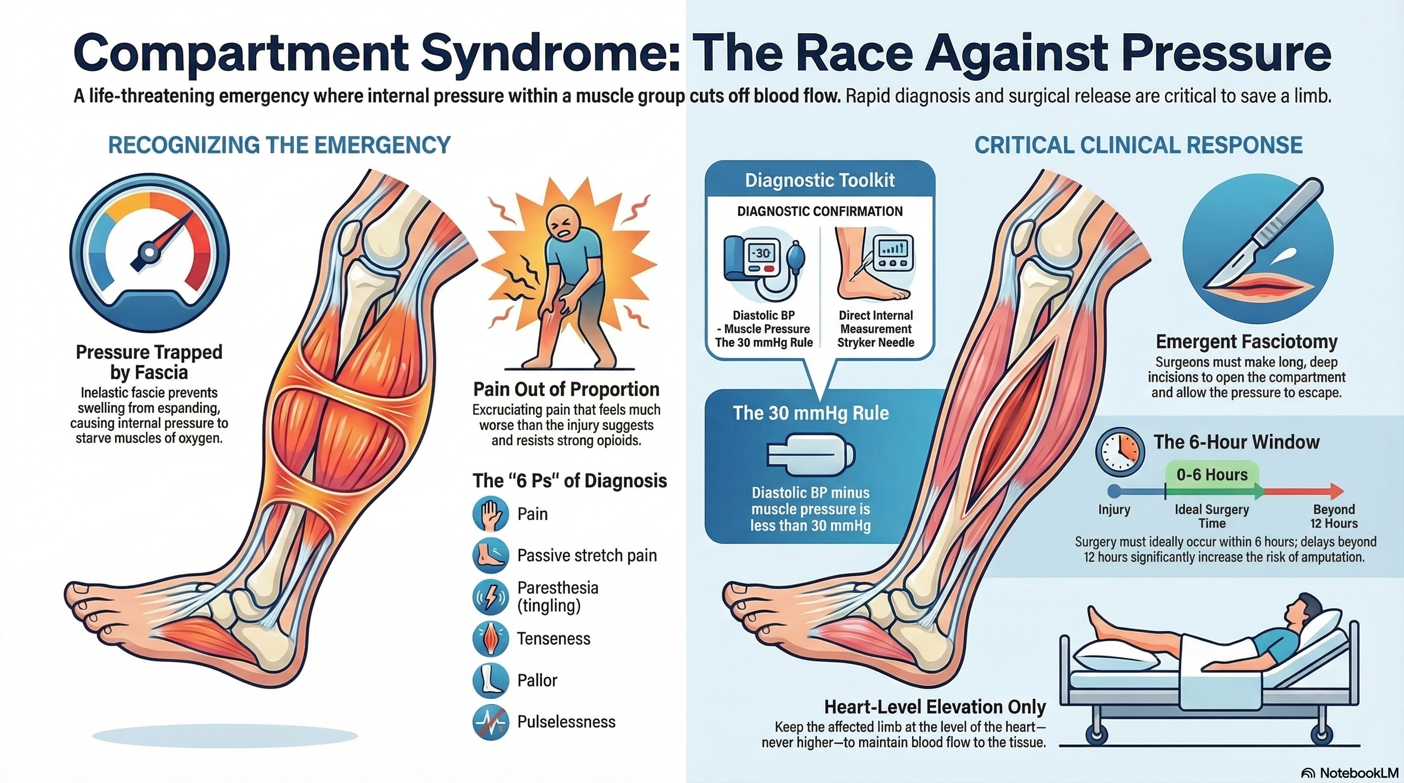 Compartment syndrome is a surgical emergency that occurs when excessive pressure builds up within a closed muscle "compartment." In the human body, muscles, nerves, and blood vessels are grouped together in areas surrounded by a tough, inelastic web of tissue called fascia. Because the fascia does not stretch, any swelling or bleeding within that space causes the internal pressure to rise rapidly.