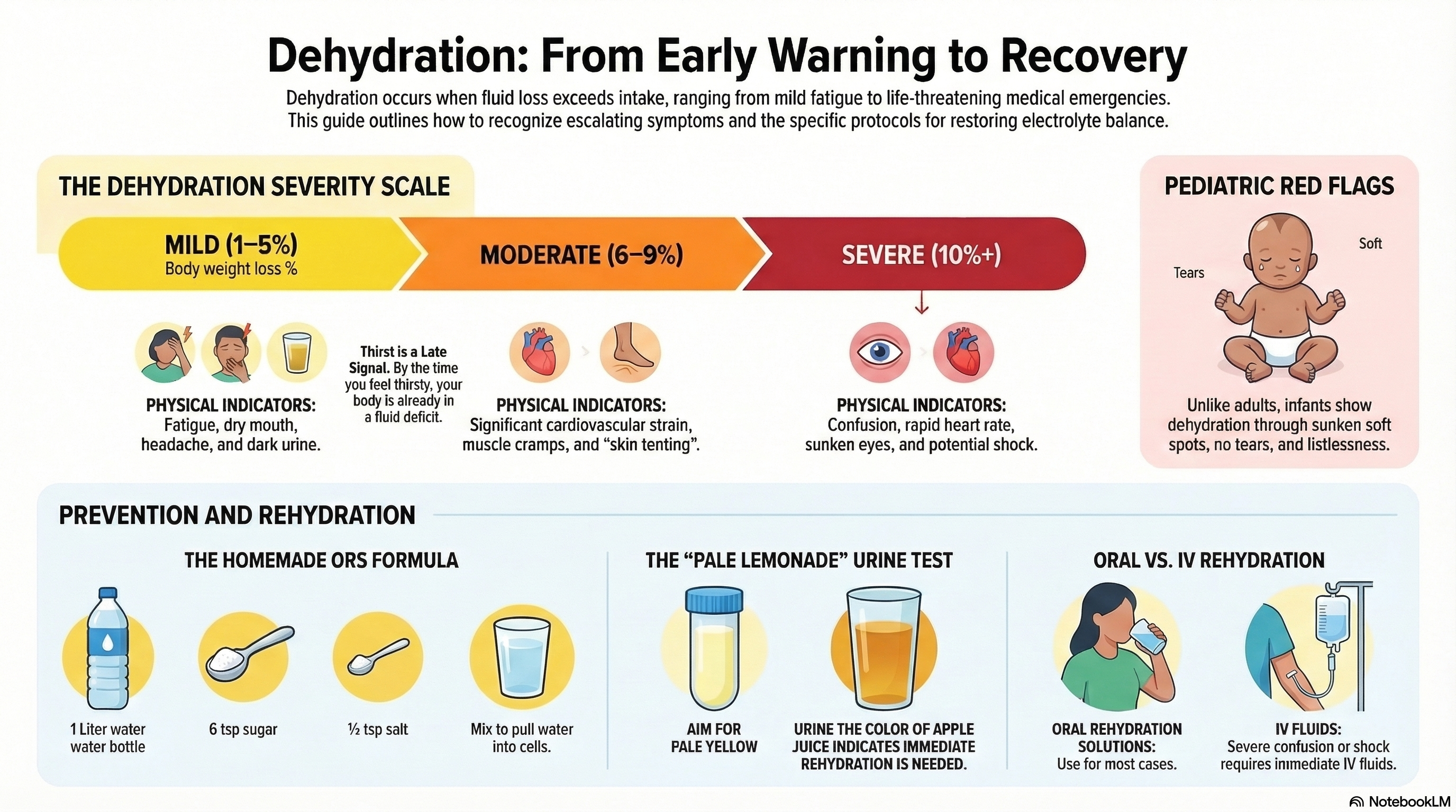 What to Avoid: Plain water alone is often not enough for moderate cases, especially in children, as it lacks electrolytes. Avoid soda, undiluted sports drinks, and alcohol.